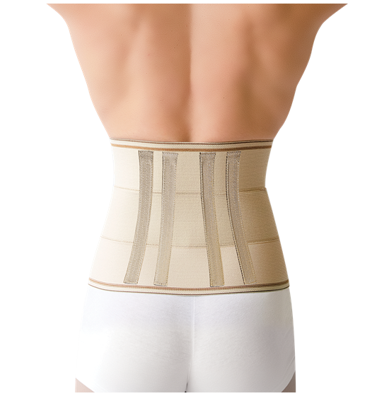 Ζώνη οσφύος τριών ελαστικών λωρίδων των 8cm. Σταθερή με ανατομική εφαρμογή στη μέση. Η επιπλέον ενίσχυση των ελαστικών λωρίδων επιτυγχάνει τη σωστή επαναφορά. Ενισχυμένη με τέσσερεις μπανέλες στην οσφυϊκή χώρα. Αυτοκόλλητο κλείσιμο εμπρός με velcro.